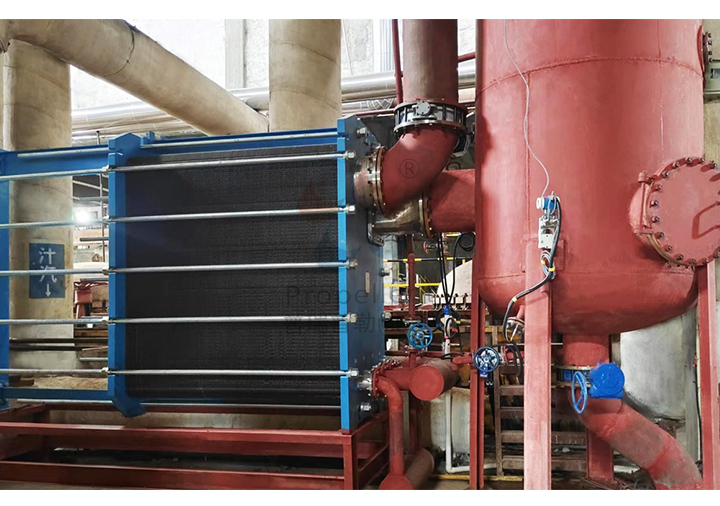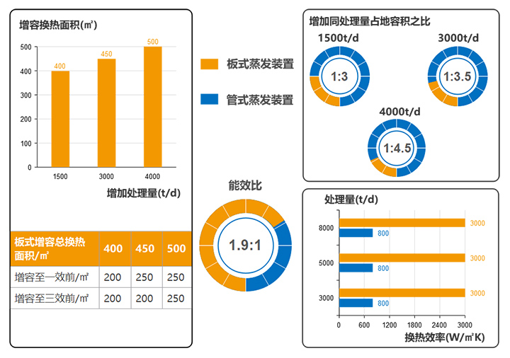 原有蒸發系統基礎,車間設計緊湊,沒有擴容管式蒸發罐體空間。而板式蒸發器體積小、蒸發能力高(蒸發能力是同等面積蒸發罐的1.9倍左右)且易安裝維護,可根據擴容后的各效蒸發效能和抽汽量查定,隨時調整各效所增加的板片數(即蒸發面積),在擴容生產中發揮著巨大的作用,完全解決隨機擴容生產的要求。